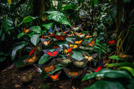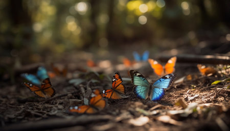 many colorful butterflies in the forest with green leaves and brown dirt on the ground, surrounded by dark foliages. Generative Ai
