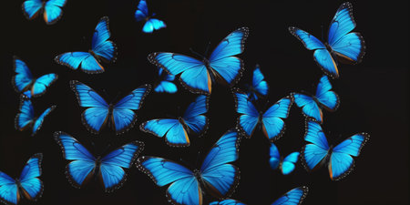 group of blue butterflies arranged in a circle on a black background.
