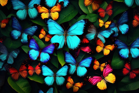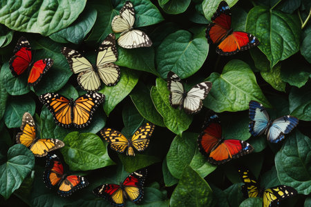 A vibrant display of butterflies on lush green leaves celebrating nature's color diversity