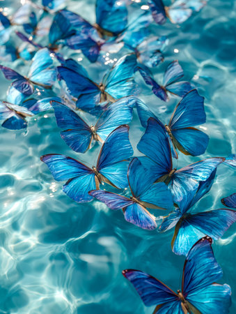 Serene azure butterflies drift softly across a glistening water mirror, creating a tranquil scene filled with delicate movement and shimmering reflections.