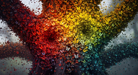 A surreal and beautiful fantasy image of a large tree whose branches and trunk are completely covered in a swarm of butterflies, colored in a vibrant rainbow gradient. This artistic concept symbolizes transformation, diversity, unity, and the magic of nature.