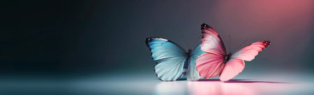 Two butterflies, one blue and one pink, rest gracefully on a smooth surface, illuminated by soft ambient light, highlighting their delicate wings and vibrant colors.