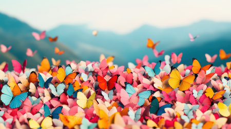 A vibrant scene of colorful butterflies fluttering over a landscape, creating a picturesque moment filled with beauty and nature.