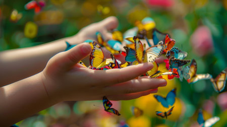 A child's outstretched hand adorned with colorful butterflies, capturing the magic of innocent wonder and nature's beauty.