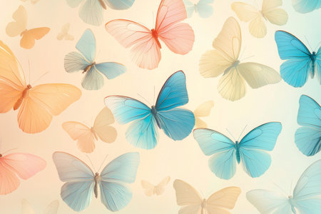 A dreamy arrangement of pastel butterflies in shades of blue, orange, and yellow, gracefully flying against a light, airy background.