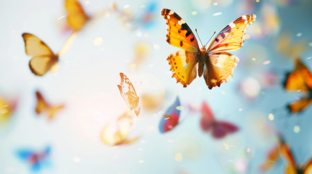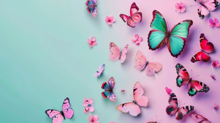 Butterflies move through the air, showcasing various colors against a smooth and colorful background, adding life to the setting.