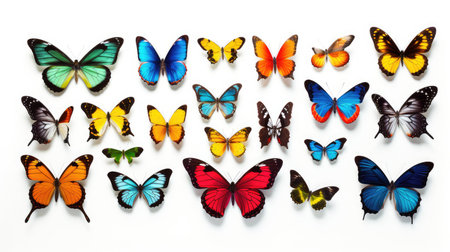 Colorful group of butterflies isolated on white background. Top view.