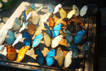 Beautifully arranged preserved butterflies in vibrant colors on a wooden tray showcasing nature s diversity and artistry