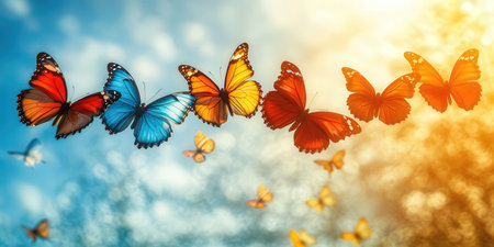 A rainbow of butterflies gracefully dancing in a sunlit meadow, a symphony of hues against a clear blue sky.