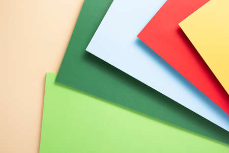 Abstract background from colored paper of red, yellow and green colors. Minimal geometric shapes and lines in pastel colors. Colored pastel paper texture minimalism. Cardboard backgrounds.