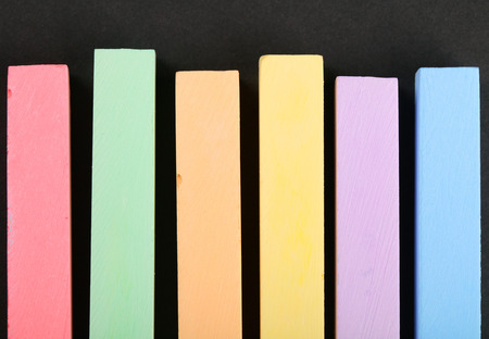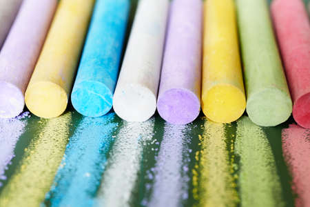 Chunks of multicolored chalk, pastels on the school board. Yellow, pink, red, green, gray, light green crimson
