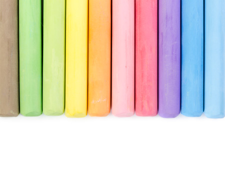Pieces of chalks in a variety of colors arranged in line on a white background. Back to school,education, arts, creative. Image with room for text