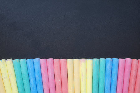 Black empty chalkboard for copy space with colorful pieces of chalk, ideal for education and welcome back to school background.