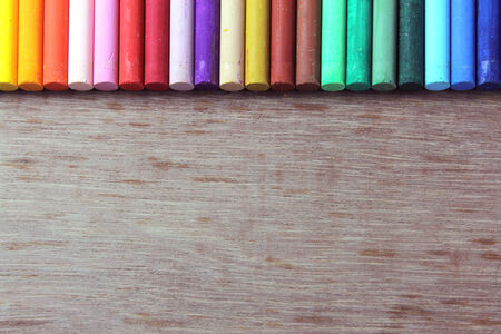 Colored chalk sticks on old wood board as copy space background. Education or back to school concept