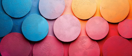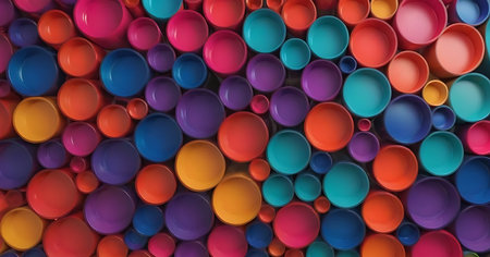 Various round shapes in vibrant colors create an abstract design against a smooth surface with gentle lighting.