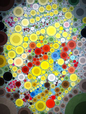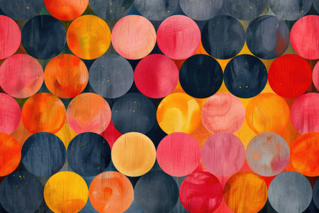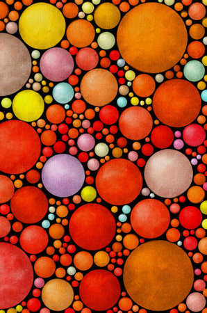 Layers of colored circles overlap on a textured surface, blending various tones and creating a visually engaging abstract composition that captures attention.