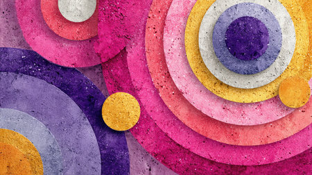 This striking abstract design showcases vibrant circular shapes in shades of pink, purple, yellow, and white. Ideal for creative projects and backgrounds.