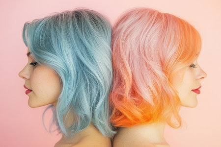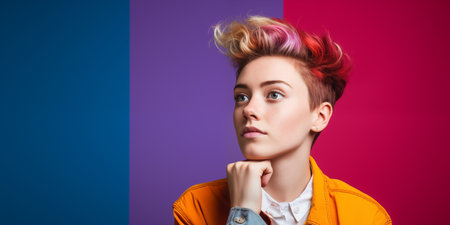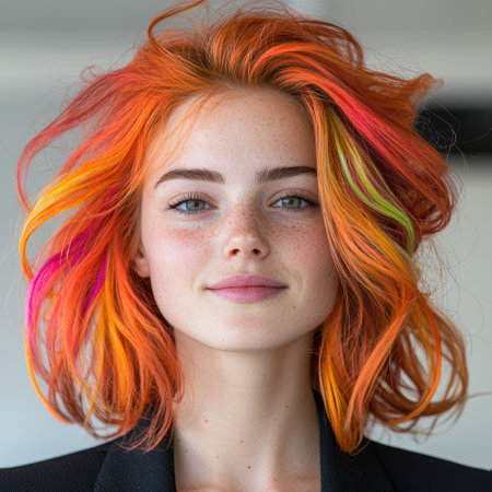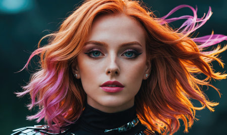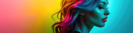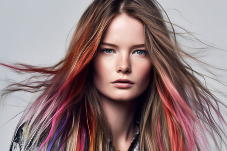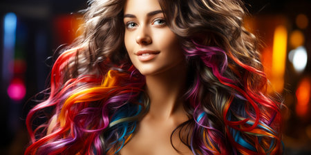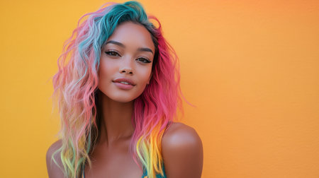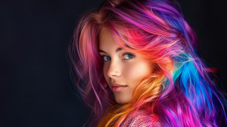 A captivating portrait featuring a model with vibrant, colorful hair and flawless makeup. The striking colors and artistic lighting create a modern and stylish atmosphere.