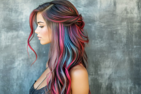 A young woman with long, flowing hair featuring vibrant pink and blue highlights poses elegantly against a textured gray backdrop, showcasing her hairstyle and features.