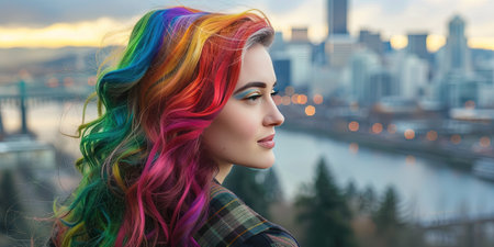 Portrait of a beautiful young woman with bright rainbow hair on the background of the city