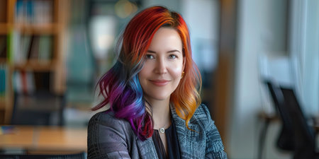 An office worker with striking rainbow-colored hair and stylish glasses confidently expresses her individuality while seated at a desk in a contemporary work environment.