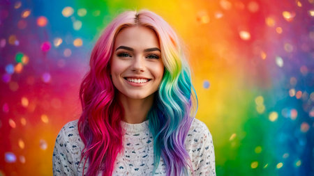 Colorful Rainbow Hair and Sparkling Background in a Studio Setting With a Young Woman.