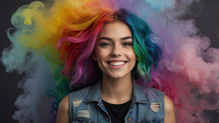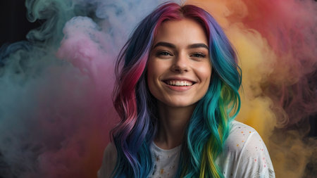 Young Woman With Colorful Hair Smiling Against a Rainbow Background of Vibrant Smoke.