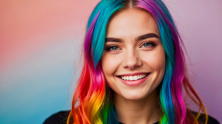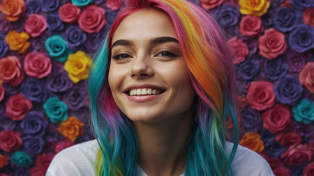 Young woman with vibrant rainbow hair smiles brightly against a colorful background in a cheerful indoor setting.