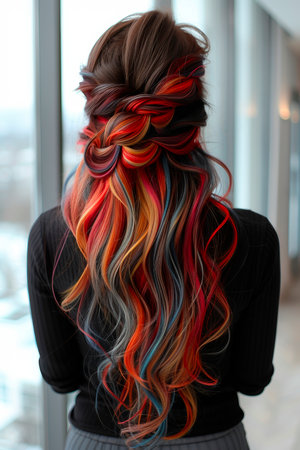 Woman with long colorful hair is turning, her hair flowing in the wind