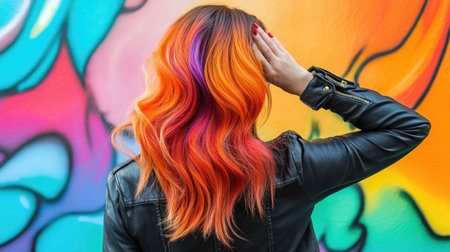 A striking back view of a woman showcasing her vibrant, colorful hair against an abstract mural background, reflecting creativity and bold style.
