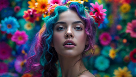 Beautiful woman with vibrant multicolored hair and flower crown posing against a backdrop of colorful flowers. Ai generated image