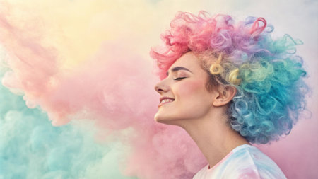 A portrait of a person with bright colorful hair their face adorned with a gentle smile. Surrounding them is a swirling mist of pastel colors blending seamlessly to evoke a feeling.