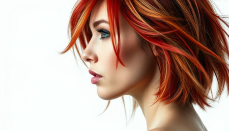 Woman with red hair and orange highlights. She has a pink lip and a blue eye. The hair is styled in a short, choppy cut