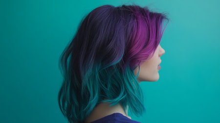A vibrant hairstyle featuring purple and teal colors against a teal backdrop