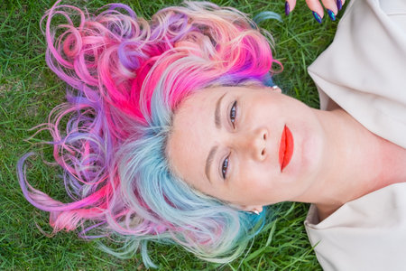 Caucasian woman with colorful hair on green grass