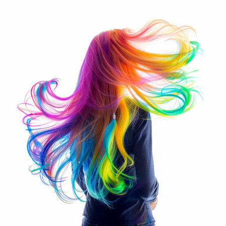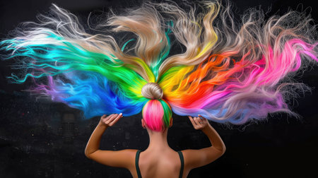 A stunning display of vibrant, rainbow-colored hair showcasing creativity and artistic flair. The flowing locks create a mesmerizing visual effect against a dark background, evoking feelings of joy and freedom. Perfect for beauty and fashion themes.
