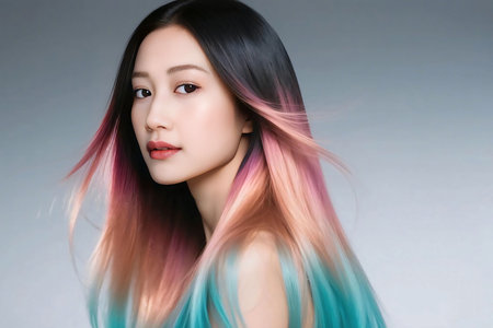 Portrait of a beautiful woman with silky long ombre hair blending black, pink, peach, and aqua blue. Soft lighting, flowing motion, and modern beauty style on gradient background.