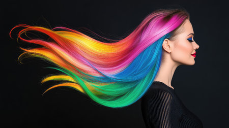A stunning profile view of a woman showcasing vibrant, flowing hair that transitions through a spectrum of colors against a dark backdrop, capturing beauty and motion.
