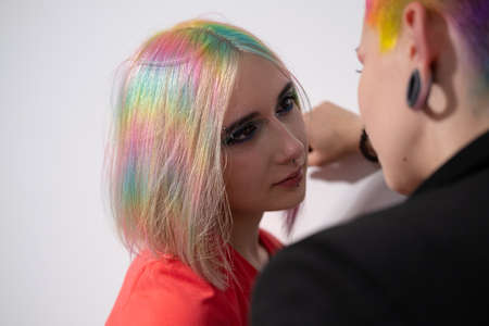 Young lesbian woman couple with vivd colored short hair and jackets posing on white background. Piercing on the face, tunnels in the ears. The concept of same-sex wedding.