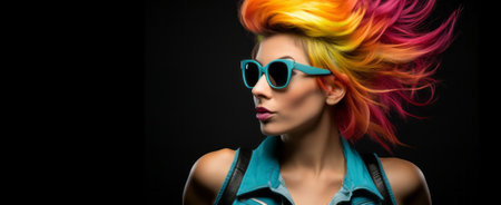 Portrait of a beautiful woman with colorful hair and sunglasses over black background.