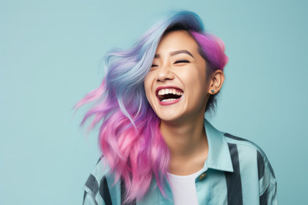 Smiling asian young woman with colorful hair studio portrait. AI generative