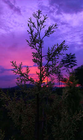 beautiful sunset with big tree in colorful filtered