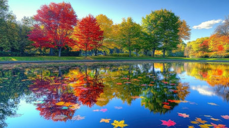 This stunning image captures the vibrant colors of autumn foliage reflecting in a serene lake under a bright blue sky, creating a picturesque landscape.