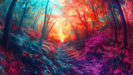 A mesmerizing forest path drenched in vibrant colors and glowing light, creating an enchanting atmosphere perfect for exploration and adventure.