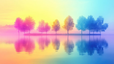This artistic image showcases a mesmerizing sunset reflecting off a serene lake, featuring colorful trees that evoke a dreamlike atmosphere of tranquility and beauty.