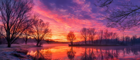 Bright hues fill the sky as the sun rises on Christmas morning illuminating frosty trees by the serene lake. A peaceful holiday scene unfolds.