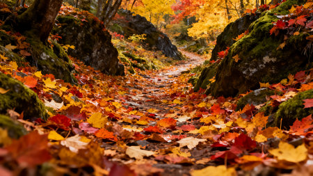 Autumn scenery with vibrant fallen leaves in forest creek. Concept of autumnal beauty, nature landscapes, serene outdoor environments. Beautiful autumn background.