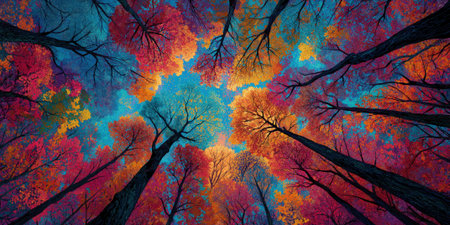 looking up at colorful autumn trees from forest floor, vivid fall foliage in red, orange, yellow and green, blue sky with clouds visible through branches, symmetrical composition, vibrant colors, magical forest vibe.