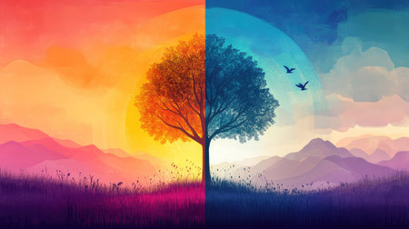A stunning digital artwork featuring a vibrant tree surrounded by a colorful gradient background. The design captures the essence of seasonal changes with artistic flair.