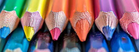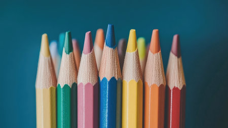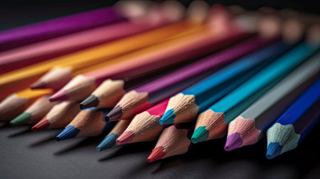 Sharpened colored pencils arranged in a fanned out diagonal line, showcasing a vibrant rainbow spectrum. ideal for art, education, creativity, and school supplies concepts.